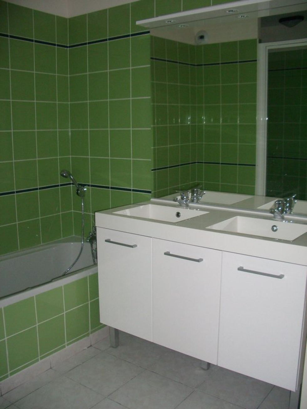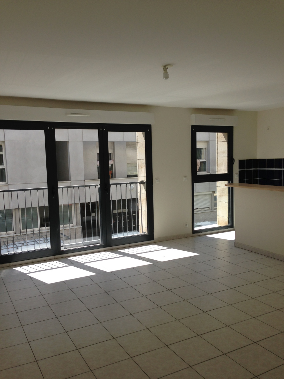 Bordeaux Bastide dans une résidence proche Mégarama et Place Stalingrad, grand T3 comprenant une entrée avec placard, un séjour avec cuisine ouverte non équipée, 2 chambres avec placards, une salle de bains équipée de 2 vasques, une baignoire et une cabine de douche, une buanderie, un WC. 1 Parking - Local vélos. Pas de balcon. Avec assurance loyers impayés